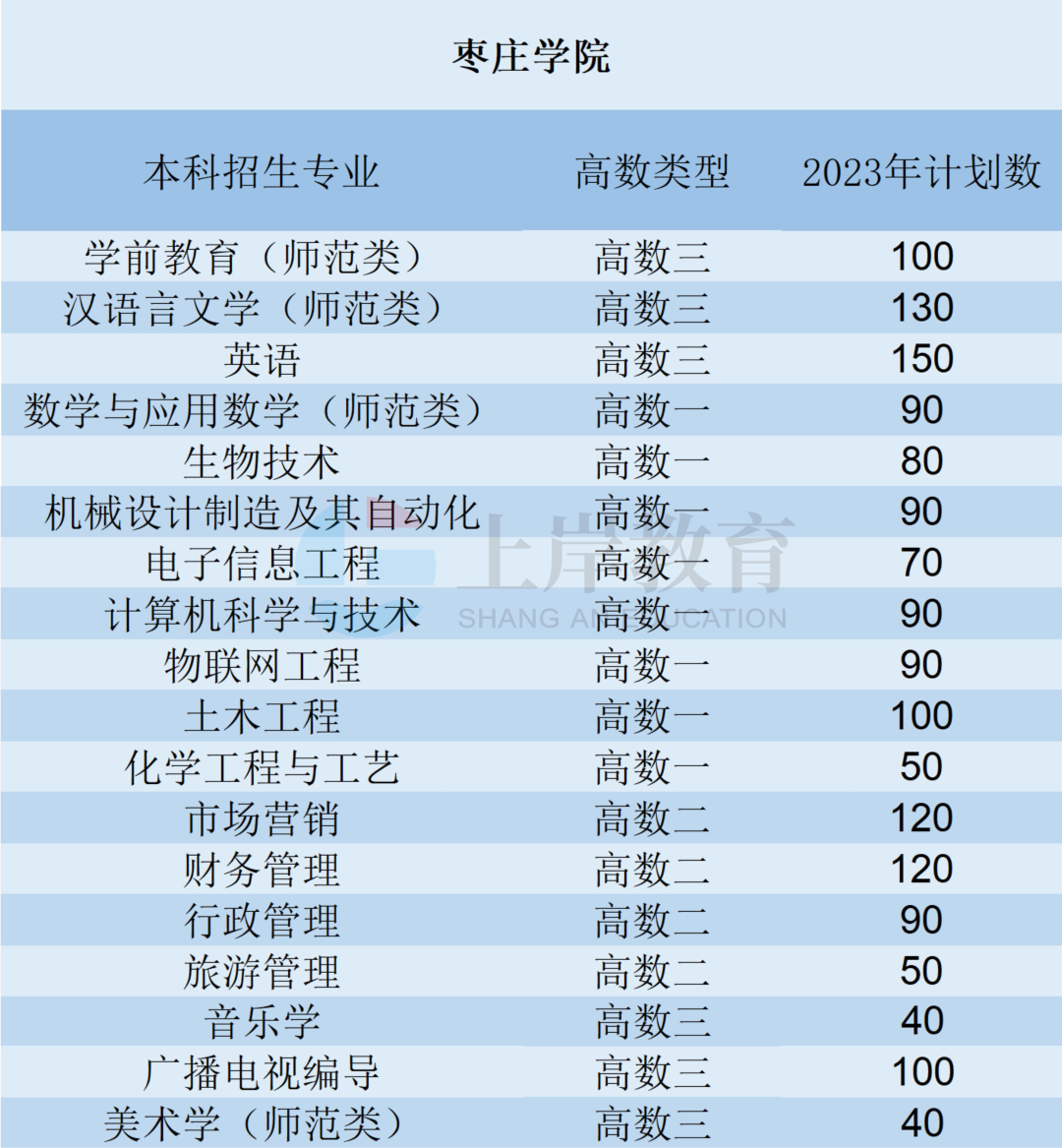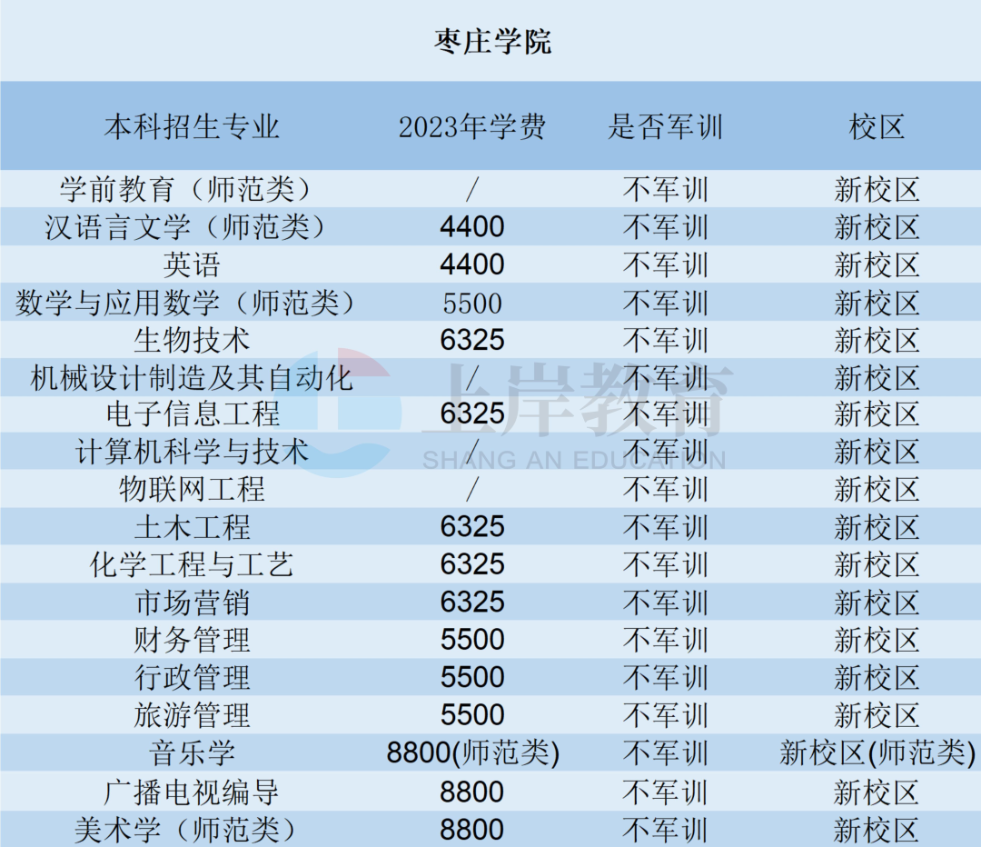 几千年时代涓流不息,这里诞生过诸如鲁班、墨子(故里滕州)等对后代影响深大的名仕佳才。如今,这座矗立于京杭运河一侧的历史古都凝聚了太多不同的文化,为踏入这里的每一个人传递着无与伦比的时代之音,而今天,我们要说的便是坐落于这座城市之中的院校——枣庄学院。前人著写文墨、后人传递深要。枣庄学院的校训“兼爱尚贤、博物戴行”便是取自先秦文化典籍《墨子》,它传递着以人为本,以贤者为师,培养有爱心和社会责任感的人;尊重知识,崇尚科学,理论与实践相结合的思想,体现了枣庄学院“办学以教师为本、教学以学生为本”的办学理念和“培养富有社会责任感和创新创业精神,基础实、能力强、素质高,适应区域经济社会发展的应用型人才”的办学目标。枣庄学院,位于山东省枣庄市,是山东省属公办全日制普通本科高校,入选数据中国“百校工程”项目院校。学校前身为1971年建立的枣庄市教师进修学校,2017年成为省级硕士立项建设单位。据统计,学校先后被列为教育部第一批30所ICT产教融合创新基地之一,截至2023年2月,学校建有山东省微纳技术院士专家工作站、山东省石榴资源综合开发工程实验室、山东省智慧物流技术与运输系统工程实验室等省市级科研平台100余个。学校目前共有新:山东省枣庄市薛城区祁连山路(在建)旧:山东省枣庄市市中区北安路1号(277000)两个校区,专升本学子就读于新校区。(一)2023年枣庄学院专升本招生专业共18个,其专业、高数要求及招生人数如下图所示:(二)2023年枣庄学院学费,各专业就读校区与军训情况如下:(三)近三年枣庄学院投档线对比,大部分专业分数有所提升,部分专业分数降低,升本难度低:学习氛围:严师出高徒,对想要浓厚学习氛围或者想要考研的同学来说,这里是一个很好的选择。枣庄学院的管理比较严格,设立早晚自习,各个教室、自习室等宽敞明亮,为学习保留了足够的空间。美好生活:学院设有四个餐厅、桂圆、榴园、枫园、枣园,其中榴园餐厅内做了新的装修设计,使同学们的用餐环境更加舒适。校区内还开设大型超市、购物中心等日常购物场所,满足学生们的基本需求。而且学校在校内澡堂设立隔间,避免了部分地域城市同学的尴尬。宿舍环境大致分为六人间与八人间,两张上下铺、六人间都是上床下桌。其中部分宿舍有独立阳台或独立卫生间、风扇等,适宜同学们的日常休息。作为一个拥有多元文化的城市,枣庄有着足够的历史让同学们探究,同时,这里也是一个潜心学习,冲刺考研的好地方,大量的教室、美术自习室满足了许多同学安静学习的需求,祝愿各位同学成功上岸。